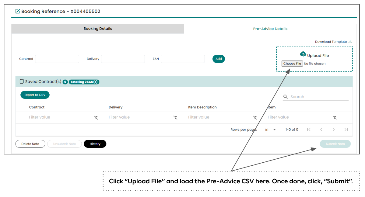 Please note: The pre-advice upload my pop up with 'error' notifications. If it does this but you are still able to click the submit button, please do so- these will get picked up by our internal data team and nothing further needs to be actioned on your end.